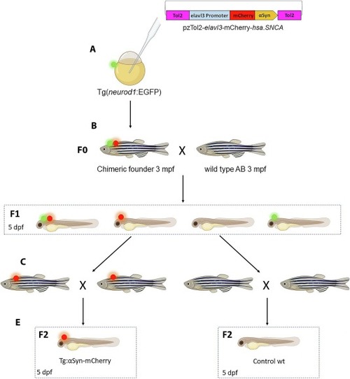Generation of transgenic Tg(elavl3:mCherry-hsa.SNCA) and control lines. Schematic representation of the breeding procedure used to obtain the F2 and control larvae to perform all experiments. (A) 600 ng/μL of pzTol2-elavl3-mCherry-hsa.SNCA and 250 ng/μl of Tol2 mRNA were injected into embryos at one-cell-stage of the transgenic line Tg(neurod1:EGFP). (B) At 3 months post fertilization (mpf) chimeric animals that showed expression of both mCherry-αSyn (red dot) and EGFP (green dot) were crossed with wild-type AB fishes: parents able to transmit the transgene were selected as founders (F0) and were outcrossed with AB fishes to obtain F1 generation in which four phenotype were present: Tg(neurod1:EGFP)+ / Tg(elavl3:mCherry-hsa.SNCA) + larvae showed both green and red fluorescence, Tg(neurod1:EGFP)+ / Tg(elavl3:mCherry-hsa.SNCA)- larvae showed only green fluorescence, Tg(neurod1:EGFP)- / Tg(elavl3:mCherry-hsa.SNCA) + larvae had only mCherry-αSyn expression, while the Tg(neurod1:EGFP)- / Tg(elavl3:mCherry-hsa.SNCA)- had no fluorescence expression or transgenic construct integrated in the genome. (C) F1 Tg(neurod1:EGFP)- / Tg(elavl3:mCherry-hsa.SNCA) + (red spot) and Tg(neurod1:EGFP)- / Tg(elavl3:mCherry-hsa.SNCA)- (no spot) were selected and brought to adulthood: at 3 mpf they were inbred to generate the F2 larvae used for this study (D). (For interpretation of the references to colour in this figure legend, the reader is referred to the web version of this article.) |