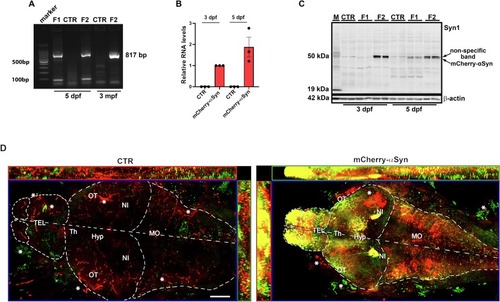 Characterization of mCherry-αSyn expression in the Tg(elavl3:mCherry-hsa.SNCA) line. (A) Representative agarose gel electrophoresis of 817 bp amplified genomic DNA extracted from Tg(elavl3:mCherry-hsa.SNCA), control larvae at 5 dpf, and fin biopsy at 3 mpf: correct amplification is visible in the F1 and F2 samples, while it is absent in control DNA. (B) Graph shows relative mRNA expression of mCherry-hsa.SNCA transgene at 3 and 5 dpf for control and F2 mCherry positive larvae pools (n = 20): relative expression was calculated with the ΔΔCt method using rpl13a as housekeeping gene. Correct amplification for the housekeeping gene was detected in all the analyzed conditions, while mCherry-hsa.SNCA primer pairs (Table 1) amplified a template only in the transgenic larvae pools (n = 20). Data are expressed as mean ± SEM, with 3 dpf mean value as reference. Experiments were done in triplicate. (C) Western blot analysis of mCherry-αSyn protein expression at 3 and 5 dpf in control, F1 and F2 20 larvae pools (n = 20), with wild-type mouse brain homogenate (M) loaded as positive control. Please note that a very faint non-specific band is detectable around 50 kDa in all zebrafish and mouse samples. This is slightly above the mCherry-αSyn signal that can be detected only in the protein extracts from transgenic larvae. Please note that F1 larvae exhibited a lower expression of mCherry-αSyn at both 3 and 5 dpf. Zebrafish samples were loaded in duplicate and β-actin was used as reference for correct total protein amount loaded. (D) Maximum intensity projection with orthogonal views of confocal images of immunofluorescence staining for 2A7 anti-αSyn antibody, highlighting different areas of the forebrain, midbrain and spinal cord of the 5 dpf F2 transgenic and control larvae: positive colocalization in neuronal cell body of mCherry and 2A7 is especially evident in the olfactory bulbs and nuclei isthmi. Red and Green aspecific signal is marked with a star close to the optic tectum and outside the brain. In the control, red signal is due to residual vessel autofluorescence, marked with a star. Scalebar 50 μm. Tel: telencephalon, OT: optic tectum, Th: thalamus, Hyp: hypothalamus, NI: nuclei isthmi, MO: medulla oblongata. (For interpretation of the references to colour in this figure legend, the reader is referred to the web version of this article.) |