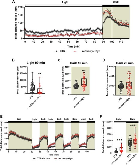 Behavioral analysis of F2 transgenic and control larvae at 5 dpf using Noldus Danio Vision chamber and a 24-well arena plate. (A) Time-course of the distance travelled by the mCherry-αSyn and control larvae during 120 min observation, with the first 90 min spent under the light and the last 30 min in the dark (indicated by the grey area), each data point represents mean ± SEM of all the different subjects, four experiments were cumulated (n = 48 CTR, n = 45 Tg). (B) Graph shows the total distance moved during 90 min of full illumination. Transgenic larvae display a statistically significant reduction in their motor activity (Unpaired t-test, ** p = 0.0011). (C) The graph shows total distance moved in the first 10 min of the dark phase, with a significant increase in the activity of the transgenic larvae compared to control siblings (Unpaired t-test, *** p = 0.0005). (D) Activity pattern during the last 20 min of the dark phase. No significant difference could be observed between controls and transgenic larvae (Unpaired t-test). (E) Time-course of the distance travelled by the transgenic versus control larvae during the WLR. The first 30 min were considered as habituation to the chamber, each data point represents the mean distance swum (± SEM) of all the different subjects (n = 37 CTR, n = 46 Tg). (F) Relative quantification of the total distance moved during the four light periods and the four dark periods (indicated by the grey area) of the swimming behavior analysis. Data from four independent experiments were analyzed by Two-way ANOVA (Interaction F (1, 162) = 23.12, p < 0.0001; photoperiod (light/dark) F (1, 162) = 17,484, p < 0.0001; genotype F (1, 162) = 1053, p < 0.0001) plus Sidak's multiple comparison test (*** p < 0.0003). (B, C, D, F) Boxplots represent the distribution of 75 %, 50 %, and 25 % of the values. Whiskers indicate the upper and lower extremes of the dataset. |