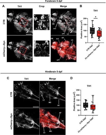 Analysis on TH1-immunopositive area in F2 mCherry-αSyn 5 dpf larvae. (A) Left panel are representative of maximum intensity projection of Z-stack images of TH1 immunolabelling zebrafish forebrain. Crop images of the TH1 channel highlight reduction of the TH1-positive area in the ventral midbrain. Right panels represent the merge of maximum intensity projections of TH1-immunolabelling and mCherry-αSyn signal. OB: olfactory bulb, OT: optic tectum, PrT: pretectal area, vPT: ventral posterior tuberculum. LC: locus coeruleus (B) Graphs showing the analysis of TH1-positive area in the forebrain of control and mCherry-αSyn 5dpf larvae. Single data points are representative of the total surface area of TH1-positive circuits in the forebrain, measured with Imaris surface tool. Boxplots represent the distribution of 75 %, 50 %, and 25 % of the values. Whiskers indicate the upper and lower extremes of the dataset. Transgenic larvae showed a significant reduction in the total TH1-positive area of the forebrain compared to controls with Mann Mann-Whitney U test (* p = 0.0264), n = 20 controls and n = 21 transgenics. (C) Maximum intensity projection of Z-stack images of TH1-positive area in the hindbrain. (D) Graphs showing the analysis of TH1-positive area in the hindbrain of control and mCherry-αSyn 5dpf larvae. Single data points are representative of the total surface area of TH1-positive circuits in the forebrain, measured with Imaris surface tool. Boxplots represent the distribution of 75 %, 50 %, and 25 % of the values. Whiskers indicate the upper and lower extremes of the dataset. No significant difference could be detected between control and transgenic larvae. Scalebar 100 μm. LC: locus coeruleus, MO: medulla oblongata, AP: area postrema, SC: spinal cord. |