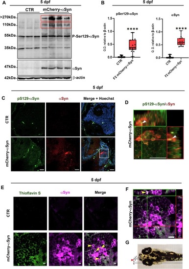 pSer129-αSyn immunoblotting and Thioflavin S/αSyn staining on F2 mCherry-αSyn 5 dpf larvae. (A) Western blot analysis showed the presence of high molecular weight pSer129-αSyn bands in the total protein extracted from F2 mCherry-αSyn pools of 20 larvae at 5 dpf. (B) Graph shows relative densitometric quantification relative to β-actin of the bands in the upper red box. Boxplots represent the distribution of 75 %, 50 %, and 25 % of the values, with experiments done in triplicate, n = 5, and samples loaded in double, Mann-Whitney U test, **** p < 0.0001. (C) Confocal images of double fluorescent immunolabelling with anti-pS129-αSyn (AF488) and anti-αSyn (2A7) (Cy5) antibodies (Table 2) on 5 dpf larval sagittal sections of control and F2 mCherry-αSyn midbrains. Non-specific signal in green is marked with a star. Scalebar 20 μm. (D) Orthogonal projection of 4× crop from image C, showing accumulation of anti-pS129-αSyn positive inclusions (arrows). Scalebar 20 μm. (E) Confocal images of the Thioflavin S-positive signal, indicative of fibrillary aggregation, in co-localization with αSyn (2A7) immunopositive labeling in the lateral medulla oblongata (MO) of transgenic and control larvae at 5 dpf. Please note that an asterisk is located nearby non-specific signals, while yellow arrows indicate Thioflavin-S/ αSyn-positive inclusions. Scalebar 10 μm. (F) Orthogonal projection of the x-axis (green rectangle) and y-axis (red rectangle) of the image presented for the mCherry-αSyn transgenic larva in panel E. Scalebar 10 μm. (G) Image adapted from online Developmental Atlas, showing region of the section displayed in (Csingle bondF) (red arrow). (For interpretation of the references to colour in this figure legend, the reader is referred to the web version of this article.) |