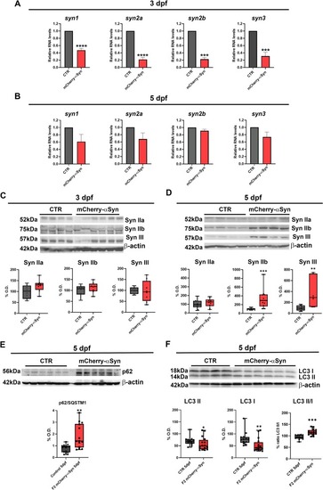 mCherry-αSyn expression affects Synapsins, p62 and LC3 levels. (A-B) mRNA expression of zebrafish synapsins at 3 and 5 dpf for control and F2 mCherry positive 20 larvae pools, relative expression was calculated with the ΔΔCt method using rpl13a as housekeeping gene: (A) at 3 dpf all synapsins are downregulated in the mCherry-αSyn larvae compared to age-matched controls (Unpaired t-test, p < 0.0001, ****, p = 0.0005, ***). (B) At 5 dpf a not significant reduction in the mRNA levels of the four synapsins genes is still present in the transgenic larvae compared to the wild-type-like controls (Unpaired t-test). (C) Western blot analysis of synapsin IIa, IIb and III protein levels at 3 dpf from 20 larvae pools of F2 mCherry-αSyn and controls: SynIIb and SynIII levels had a slight but non-significant increase in the transgenic larvae pools. Boxplots represent the distribution of 75 %, 50 %, and 25 % of the values (Mann-Whitney U test, N = 3, n = 3, 20 larvae pools). (D) Western Blot on transgenic and control larvae pools at 5 dpf showed a significant increase of Syn IIb and Syn III protein levels in the F2 mCherry-αSyn samples compared to controls (Mann-Whitney test, ** p = 0.0068, *** p = 0.0003). Boxplots represent the distribution of 75 %, 50 %, and 25 % of the values, with experiments done in triplicate, n = 5 (20 larvae pools) for each condition, samples loaded in double. (E) Western blot for p62/SQSTM1 on F2 mCherry-αSyn and wild-type-like controls at 5 dpf showed a significant increase of p62 levels in transgenic pools compared to the controls (Mann-Whitney test, ** p = 0.0018). Boxplots represent the distribution of 75 %, 50 %, and 25 % of the values, with experiments done in triplicate, n = 7 (20 larvae pools) for each condition, samples loaded in double. (F) Western blot for LC3 on F2 mCherry-αSyn and wild-type-like controls at 5 dpf, where LC3 I and II levels are significantly reduced (Mann-Whitney test, * p = 0.0499, ** p = 0.0035), while LC3 II/I ratio is higher (Mann-Whitney test, *** p < 0.0001) in transgenic larvae pools compared to controls. Boxplots represent the distribution of 75 %, 50 %, and 25 % of the values, with experiments done in triplicate, n = 5 (20 larvae pools) for each condition, samples loaded in double (C, D, E, F). Graph shows relative densitometric quantification to β-actin. |