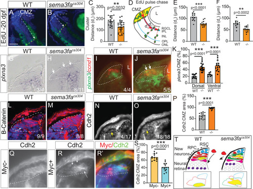 Altered size and cell composition of CMZ-derived radial cohorts with loss of Sema3fa. EdU labelling of retinas of 20 dpf zebrafish larvae incubated for 4 hrs with EdU at 5 dpf. |