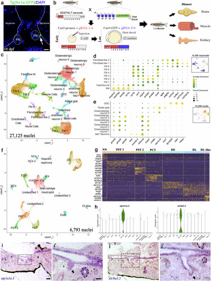 snRNA-Seq identifies various cell types from zebrafish muscle, kidney, and brain. |