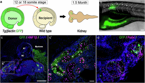 Transplanted GFP+ somite contributed to mesonephric nephrons in recipient fish. |