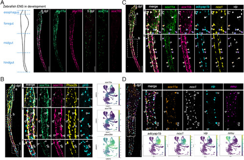Sox11a and sox11b expression overlap with inhibitory motor neuron clusters. All staining images were after “Max Intensity” z-stack projection. (A) Left: Illustration of zebrafish developing ENS separated into foregut, midgut, and hindgut. Right: Transient expression of both sox11a and sox11b in gut at 3 dpf, and only sox11a expression at 5 dpf. (Scale bar, 100 μm.) (B) Overlapping expression of sox11a, sox11b, Phox2b, and pH3 in the ENS at 3 dpf. The white dash box indicates the zoomed region on the right. Arrows indicate cells coexpressing sox11a/b, Phox2b and proliferation marker pH3. (Scale bar, 100 μm, and 50 μm for zoomed region.) (C) Coexpression pattern between sox11a, sox11b, and inhibitory motor neuron markers, adcyap1b, vip, and nos1 at 3 dpf. The white dash box indicates the zoomed region on the right. Arrows point to cells coexpressing sox11a/b and neuronal markers: hollow arrows:sox11a+/sox11b+/adcyap1b+/nos1+/vip− cells, white arrows:sox11a+/sox11b+/adcyap1b−/nos1−/vip+ cells, orange arrows:sox11a−/sox11b+/adcyap1b+/nos1+/vip− cells, purple arrows:sox11a+/sox11b+/adcyap1b+/nos1+/vip+ cells, blue arrows:sox11a+/sox11b−/adcyap1b+/nos1+/vip+ cells. (Scale bar, 100 μm, and 50 μm for zoomed region.) (D) Coexpression pattern between sox11a and only vip at 5 dpf. The white dash box indicates the zoomed region on the right. Arrows indicate cells coexpressing sox11a and vip. (Scale bar, 100 μm, and 50 μm for zoomed region.) |