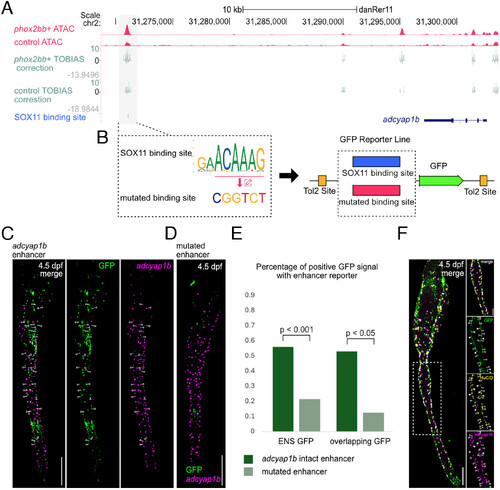 Putative SOX11 binding site in an adcyap1b enhancer. All staining images were after “Max Intensity” z-stack projection. (A) TOBIAS provides Tn5 bias correction of bulk ATAC seq results and SOX11 footprinting. (B) The adcyap1b enhancer with either the intact or mutated SOX11 binding site was cloned into the GFP reporter plasmid. (C) At 4.5 dpf, embryos showed adcyap1b enhancer mediating GFP reporter expression in the gut. Arrows indicate cells coexpressing GFP and adcyap1b. (Scale bar, 100 μm.) (D) At 4.5 dpf, embryos showed a reduction in adcyap1b enhancer-mediated reporter expression after mutation of SOX11 binding sites. (Scale bar, 100 μm.) (E) Enhancers with mutated SOX11 binding site showed a significant reduction in the percentage of positive GFP signal in ENS (ENS GFP, Nadc = 60, Nmut = 51, replicates = 3; overlapping GFP, Nadc = 17, Nmut = 16, replicates = 3). (F) Antibody and HCR staining comparing coexpression of GFP signals, HuC/D and adcyap1b in ENS of Tg(+32adcyap1b:GFP) at 4.5 dpf. The white dash box indicates the zoomed region on the right. Hollow arrows point to GFP+/HuC/D+/adcyap1b+ cells, white arrows point to GFP+/HuC/D+/adcyap1b− cells, and blue arrows point to GFP+/HuC/D−/adcyap1b− cells. (Scale bar, 100 μm, and 50 μm for zoomed region.) |