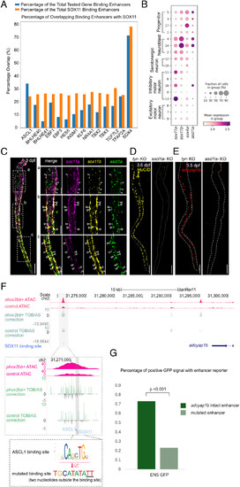 ASCL1 has a binding site adjacent to the putative binding site of SOX11. All staining images were after “Max Intensity” z-stack projection. (A) SOX4 and ASCL1 show the top percentage of overlapping enhancers that contain putative binding sites with SOX11. (B) scRNA-seq analysis suggested that sox4a was expressed in progenitor clusters, while sox11a, sox11b, and ascl1a were expressed in ENS neuroblasts. (C) At 3 dpf, ascl1a had an overlapping expression with sox11a/b, especially with sox11b. The white dash box indicates the zoomed region on the right. Arrows indicate overlapping expression between ascl1a, sox11a and sox11b. (Scale bar, 100 μm, and 50 μm for the zoomed region.) (D) Representative image of embryo with near complete loss of HuC/D after ascl1a knockout. The dotted line indicates the outline of the gut (Nascl1a = 6, Ntyr = 6, replicates = 2). (Scale bar, 100 μm.) (E) Representative image of embryo with near complete loss of adcyap1b after ascl1a knockout. The dotted line indicates the outline of the gut. (Nascl1a = 6, Ntyr = 6, replicates = 2). (Scale bar, 100 μm.) (F) ASCL1 has a putative binding site in the putative enhancer of adcyap1b. A plasmid was generated with a mutated ASCL1 binding site. (G) Enhancers with mutated ASCL1 binding site showed a significant reduction in the percentage of positive GFP signal in ENS (ENS GFP, Nadc = 60, Nmut = 56, replicates = 4). |