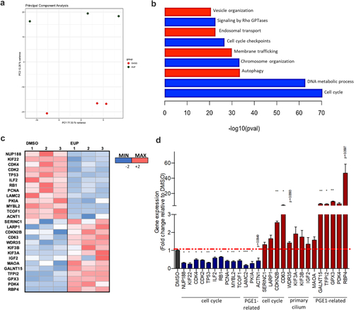 Transcriptomic analyses reveal the cellular pathways modulated in response to Eupatilin treatment. (a) Principal component analysis showing separation between the EUP-treated URECs and the DMSO-treated by PC2 variance. (b) Pertinent down (blue) or up (red) regulated pathways or relevant processes involving ciliary modulators dysregulated in |