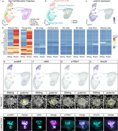 scRNA-seq indicates a hair cell differentiation fate switch in prdm1a mutants. a UMAP plot of prdm1a-/- and sibling scRNA-seq, from central support cells to mature hair cells, colored by cell type. Black arrows indicate developmental trajectory. b UMAP plot of prdm1a-/- and sibling scRNA-seq, from central support cells to mature hair cells, colored by genotype. c Feature plot of prdm1a expression in the scRNA-seq hair cell lineage sub-clustering. d Heatmap of selected genes upregulated in prdm1a-/- hair cells, and non-differentially expressed hair cell marker genes. e–h Feature plots of pvalb9, ckbb, s100a1 and tmc2a from the hair cell trajectory sub-clustered scRNA-seq. i–p HCRs of pvalb9, ckbb, s100a1 and tmc2a in 5 dpf sibling and prdm1a-/- neuromasts. Representative images of two independent experiments. q–t HCRs of pvalb9, ckbb, s100a1 and tmc2a in the lateral crista of the ear in Tg(myo6b: H2B-mScarlet) larvae, with hair cells are labeled in magenta. Scale bars= 10 µm. Representative images of two independent experiments |
