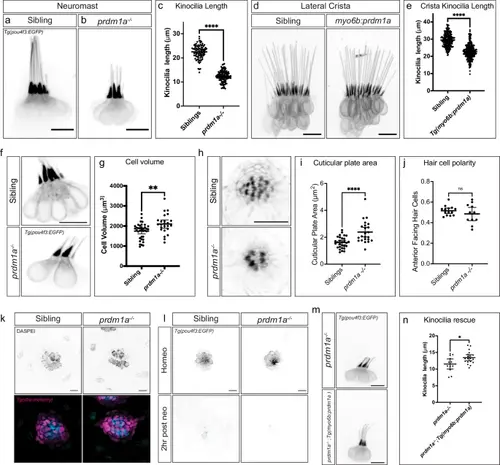 prdm1a mutant hair cell morphology changes concordant with expression changes. a,b Tg(pou4f3:EGFP) in sibling and prdm1a-/- neuromast hair cells. c Quantification of neuromast kinocilia length in sibling and prdm1a-/- hair cells. n = 11 sibling neuromasts, 89 kinocilia; n = 21 prdm1a-/- neuromasts, 117 kinocilia. Student’s two-sided t-test, ****p = 8.165*10-73. Data are presented as mean ± SD. d Tg(pou4f3:EGFP) expression in sibling and Tg(myo6b:prdm1a) cristae. Scale bars= 10 µm. e Quantification of Tg(myo6b:prdm1a) cristae kinocilia length. n = 15 sibling cristae, 226 kinocilia; n = 15 Tg(myo6b:prdm1a) cristae, 258 kinocilia. Student’s two-sided t-test, ****p = 7.314*10-54. Data are presented as mean ± SD. f Tg(pou4f3:EGFP) labeling cell bodies in sibling and prdm1a-/- lateral line hair cells. g Quantification of cell body volume in sibling and prdm1a-/- lateral line hair cells. n = 12 sibling neuromasts, 37 cell bodies; n = 11 prdm1a-/- neuromasts, 24 cell bodies. Student’s two-sided t test, **p = 0.0026. Data are presented as mean ± SD. h Phalloidin staining of sibling and prdm1a-/- neuromasts. i Quantification of cuticular plate area in sibling and prdm1a-/- neuromasts. n = 14 sibling neuromasts, 29 cuticular plates; n = 10 prdm1a-/- neuromasts, 23 cuticular plates. Student’s two-sided t-test, ****p = 6.296*10-5. Data are presented as mean ± SD. j Quantification of the percentage of anterior-polarized hair cells per neuromast. n = 14 sibling neuromasts and n = 10 prdm1a-/- neuromasts. Student’s two-sided t-test p = 0.2916. Data are presented as mean ± SD. k DASPEI uptake in sibling and prdm1a-/- lateral line hair cells. Representative of two independent experiments with similar results. l Tg(pou4f3:EGFP) in sibling and prdm1a-/- lateral line hair cells during homeostasis and 2 h after neomycin treatment. Representative of two independent experiments with similar results. m Tg(myo6b:prdm1a) overexpression in prdm1a-/- hair cells. n Quantification of kinocilia length in Tg(myo6b:prdm1a) positive and negative prdm1a-/- hair cells. n = 12 Tg(myo6b:prdm1a) negative neuromasts, 12 kinocilia; n = 19 Tg(myo6b:prdm1a) positive neuromasts. Student’s two-sided t-test p = 0.0174. Data are presented as mean ± SD. All Scale bars = 10 µm. |
