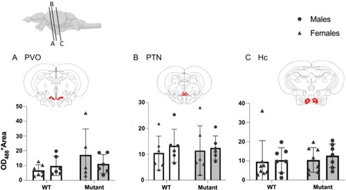 Expression of 5‐HT in positive cells in WT and mutant fish. (A) Paraventricular organ (PVO). (B) Posterior tuberal nucleus (PTN). (C) Caudal zone of periventricular hypothalamus (Hc). Red dots on frontal brain section drawings indicate areas of interest where expression is observed. Mean ± SEM. |