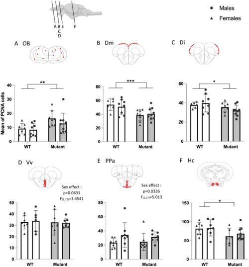 Quantification of the number of PCNA‐labeled cells in WT and mutant fish. (A) Olfactory bulbs (OB). (B) Medial zone of dorsal telencephalic area (Dm). (C) Lateral zone of dorsal telencephalic area (Di). (D) Ventral nucleus of ventral telencephalic area (Vv). (E) Parvocellular preoptic nucleus (PPa). (F) Caudal zone of periventricular hypothalamus (Hc). Red dots on schematic frontal sections indicate quantified areas. Mean ± SEM, * |