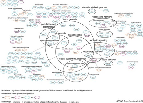Cytoscape network visualization: Functional interaction (STRING functional score: 0.50) and annotation of genes from pattern of expression (described in Figure |