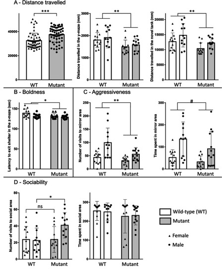 Non‐reproductive behavior in WT and mutant adult fish: Distance traveled in the shoaling test, the y‐maze, and the novel tank diving test (A). Boldness measured by the latency to exit the shelter area in the z‐maze (B). Aggressiveness test with the number of visits and the time spent in the mirror area (C). Sociability is measured by the number of visits and the time spent in the social area (D). Data are shown as mean ± SEM. * |