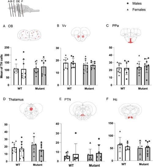 Quantification of TH‐positive cells in WT and mutant fish. (A) Olfactory bulbs (OB). (B) Ventral nucleus of ventral telencephalic area (Vv). (C) Parvocellular preoptic nucleus (PPa). (D) Thalamus. (E) Posterior tuberal nucleus (PTN). (F) Caudal zone of periventricular hypothalamus (Hc). Red plots represent regions of interest in which TH‐positive cells have been quantified. Mean ± SEM; the number of analyzed brains is indicated in each bar. |