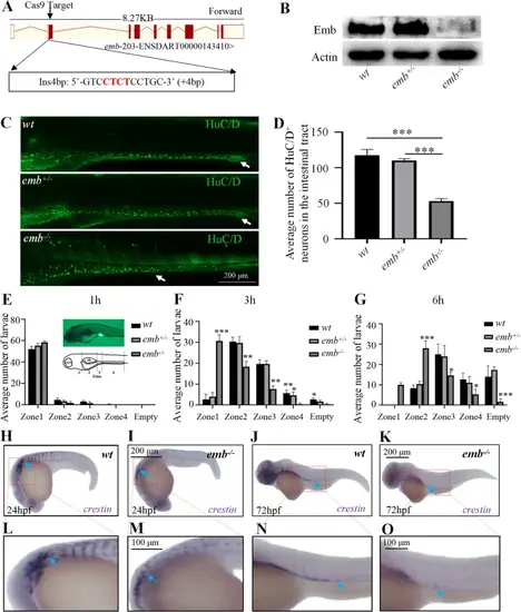 Loss of emb causes ENS defects in zebrafish. A, Generation of targeted emb mutant in Zebrafish. A 4 bp insertion in Exon 2 was introduced through the CRISPR/Cas9 system. B, Expression of the Emb protein is disrupted in different genotypes determined by western blots. C, The enteric neurons at 5 dpf zebrafish larva of wild type (wt), heterozygous and homozygous emb mutants are labeled by HuC/D and white arrows point to the most posterior margin where the enteric neurons migrated to. D, Quantification of the numbers of HuC/D positive cells in the intestinal tract, ***, p < 0.001, one-way ANOVA with Bonferroni post-hoc, N = 10 for each group. E-G, Quantification of the number of larvae in each group based on the anterior extent of tracer. “empty” means fluorescent tracers are completely evacuated in the intestine. Statistical significances compared to wt are labeled on top of each bar, *, p < 0.05; **, p < 0.01; ***, p < 0.001, one-way ANOVA with Bonferroni post-hoc, N = 60. H-K, Lateral view of in situ hybridization results of 24 hpf and 72 hpf larvae using crestin probe, blue arrows point to migrating neural crest cells. L-O, Locally enlarged images of the H–K images (Red dashed box) |