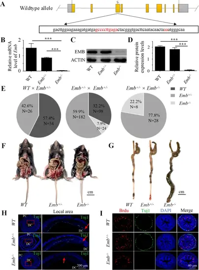 Loss of Emb causes HSCR-like phenotypes in mice. A, Using CRISPR/Cas9 system, a 13-bp frameshift deletion in exon 3 of Emb was induced. B, Emb mRNA expression is diminished in Emb-/- mice determined by quantitative real-time PCR. C, The EMB protein expression levels in different genotypes were determined by Western blotting, and the expression levels were quantified in (D). E, The percentage of each genotype in three different crossing scenarios. ***, p < 0.001, one-way ANOVA with Bonferroni post-hoc, N = 3. F, Abdominal anatomy of wild type, Emb+/- and Emb-/- mice. G, Isolated colorectal from the distal rectum to the ileocecal part, note the dry stool filled and dilated colon of the Emb-/- mice. H, Immunofluorescence staining of 6-week mouse colons; the entire colon is rolled into a donut-like shape along the longitudinal axis, and then embedded and processed into paraffin sections; the right panels are zoom-ins of the distal colon. Green, Tuj1; blue, DAPI. The red arrows indicate the enteric neurons farthest from the proximal colon, and the distance from the"red arrow"to the distal colon represents the aganglionic segment; PC, proximal colon; DC, distal colon; Quantification results are presented in Additional file 2: Fig.S5 G. I, Immunofluorescence staining of the cross sections of 2-day neonatal mouse colons. Red, Brdu; green, Tuj1; blue, DAPI. Quantification results are presented in Additional file 2: Fig.S5 H |