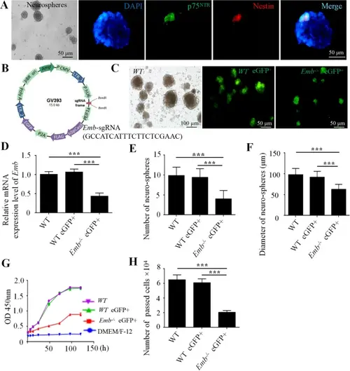 EMB is required for ENCC proliferation and migration in vitro. A, Isolated and cultured ENCCs identified by immunofluorescence double labeling of p75 (green) and Nestin (red), the nuclei are labeled with DAPI (blue). B, Schematic overview of the lentiviral construct used for Emb gene knockout in ENCCs. C, Lentivirus infection is confirmed by GFP fluorescence at day 6. D, Relative mRNA expression level of Emb in neurospheres. E, Numbers of the neurospheres are reduced upon knockout of Emb. F, Average diameter of the neurospheres is reduced upon knockout of Emb. G, Cell growth curve in the proliferation assay showing that loss of Emb affects ENCC proliferation. H, The migration ability, accessed by numbers of cells passed the matrix in the transwell assay, is affected by loss of Emb. **, p < 0.01, ***, p < 0.001, one-way ANOVA with Bonferroni post-hoc, N = 6 |