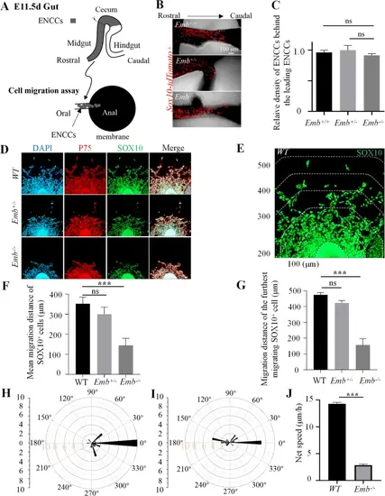 Emb is required for the migration of the ENCCs in gut explant. A, Schematic illustrating the ENCC migration assay in mouse gut explants. B Using the transgenic mice with ENCCs labeled by genetically encoded tdTomato, and the ENCCs were marked by Sox10 (red) in E12.5d mice. C, Relative density of ENCCs behind the leading ENCCs, NS, non-significance, one-way ANOVA with Bonferroni post-hoc, N = 4. D, Representative images of the in vitro ENCC migration assay, ENCCs are labeled with P75NTR (red) and Sox10 (green). E, Quantification methods of the in vitro migration assay, the membranes were divided into five regions based on the distance from the margin of the explant and the numbers of Sox10 positive cells in each region were counted and quantified. F and G, Mean migration distance of Sox10+ cells and migration distance of the furthest migrating Sox10+ cell in different groups; **, p < 0.01; ***, p < 0.001, one-way ANOVA with Bonferroni post-hoc, N = 3. H and I, Polar histograms representing the trajectories of the cells which were 150 μm from the most caudal cell at 40-min intervals in WT (H) and Emb-/- explants of E12.5d hindgut (I). The trajectories are determined by drawing a straight line from the position of cell to its position 40 min previously, with the 0 degree as the rostrocaudal axis of the gut (27 cells were examined). J, Quantification of the average net speed by measuring the distance between the location of the wave front at the beginning of the time lapse sequence and its location at the end of the sequence. ***, p < 0.001, two-tailed Student’s T test, N = 3 |