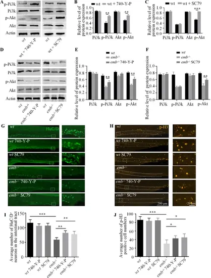 Emb regulates ENS development through the activation of PI3K pathway in zebrafish. A-C, Validation of the efficiency of the PI3K/AKT agonists (740-Y-P and SC79) in wild type zebrafish. D, Western blots of total and phosphorylated PI3K and AKT of 5 dpf zebrafish larvae, before and after exposure of agonists, the protein levels are quantified in (E and F). Representative images of immunofluorescence staining to assess the number of enteric neurons (G, HuC/D) and the levels of cell proliferation (H, p-H3). In Figure G, the dashed box in the left panel marks the most distal enteric neurons positive for HuC/D; the right panel shows a magnified view of the boxed region. In Figure H, the dashed box in the left panel indicates a representative region with high PH3 expression; the right panel shows a magnified view of the boxed region. The quantification results are presented in I and J. *, p < 0.05; **, p < 0.01; ***, p < 0.001, one-way ANOVA with Bonferroni post-hoc, N = 10 |