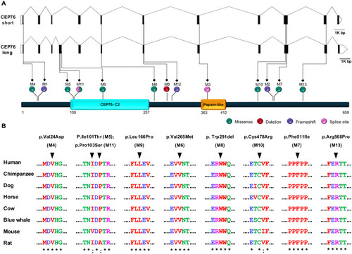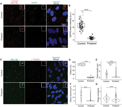 CEP76 deficiency in the family 7 proband fibroblasts impairs both primary cilium formation and structural integrity. ( |