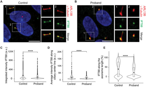 Cilia in proband fibroblasts exhibit impaired localization of anterograde IFT proteins. Immunofluorescence analysis of serum-starved fibroblast cell lines derived from the family 7 proband and a control, stained for IFT88 (anterograde IFT marker), ARL13B (primary cilium axoneme marker), and γ-tubulin (basal body marker). ( |