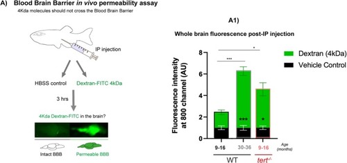 Telomerase depletion is associated with increased BBB permeability with ageing in the zebrafish brain. (A) Schematic figure of the BBB permeability assay. Dextran‐FITC 4 kDa or vehicle control (HBSS) were injected by intraperitoneal injection. 3 h later the brains were dissected and imaged in the Odyssey CLx (Li‐cor) to confirm the presence of Dextran‐FITC. Quantification of the green fluorescence in the fish brains shows higher FITC expression in old WT (> 30 months) compared to middle aged ones (9–16 months). This increased presence of dextran‐FITC in |