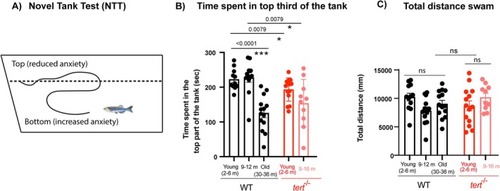 Telomerase depletion accelerates ageing‐assoicated increase in anxiety‐like behaviour. (A) Schematic figure of the setup and behaviour assessment during the novel tank test (NTT). (B) Quantifications show that old WT (30–36 months) spend less periods of time in the top part of the tank compared to younger siblings, and that this behaviour is accelerated in |