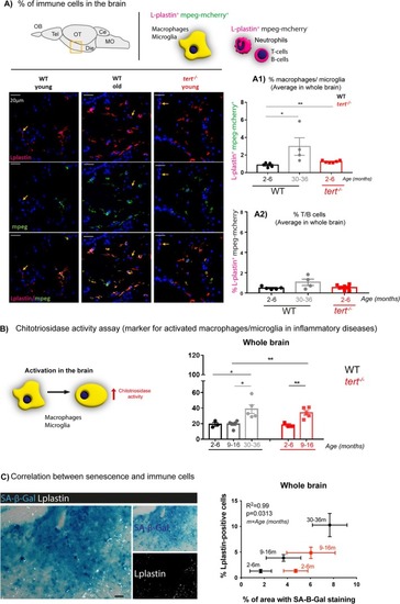 Telomerase depletion is associated with increased inflammation in the aged zebrafish brain. (A) Representative images of mpeg‐mcherry and L‐plastin staining in the diencephalon of adult zebrafish (schematic figure highlights the region imaged as diencephalon). The yellow arrows highlight Lplastin+; mpeg− cells. (A1) Quantifications of L‐plastin‐positive; mpeg‐positive cells (orange; from red and green co‐localisation) and (A2) L‐plastin‐positive; mpeg‐negative cells (red) in the whole zebrafish brain show an increased number of macrophages/microglia (L‐plastin‐positive; mpeg‐positive cells) with natural ageing, and this is accelerated in the absence of telomerase (in |