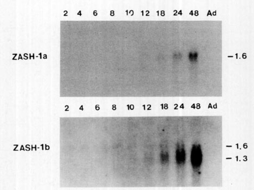 Northern blots of zebrafish embryonic and adult RNA hybridized with Zash probes. Zash-1a (top) and Zash-1b (bottom) anti-sense riboprobes were hybridized to a filter containing RNAs extracted from embryos at times (hr) indicated above each lane. The rightmost lane in each case contained poly(A)+ RNA from adult fish. A parallel gel containing the same samples was stained with ethidium bromide. The amounts of ribosomal RNA in each sample were equivalent, indicating that differences in hybridization were not due to variations of RNA loaded on the gel. |