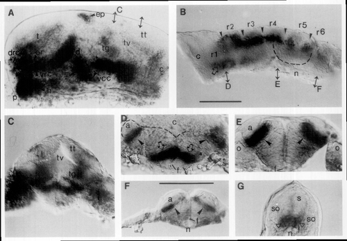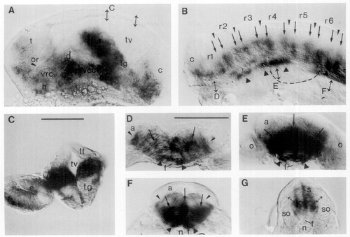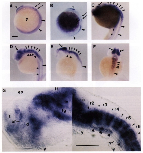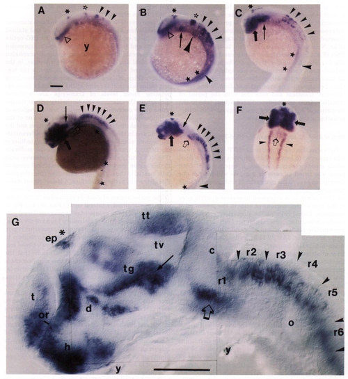 Zash-1a expression in wild-type embryos. 12-hr (A), 14-hr (B), 20-hr (C), 24-hr (D), 30-hr (E, F), and 26-hr (G) embryos were hybridized with a Zash-1a antisense probe. (A-E) Lateral views of whole-mounted embryos. (F) Dorsal view of a 30-hr whole-mounted embryo. (G) Lateral view of a thick longitudinal section of a 26-hr embryo (eyes and lateral head removed) observed by DIC optics (montage of three photographs taken at slightly different planes of focus). Symbols indicating expression sites: open triangles, ventral forebrain; asterisks, epiphysis; open stars, hindbrain-midbrain boundary; small arrowheads, rows of expressing cells in the dorsal hindbrain; open arrows, ventral cells near floor plate of cerebellum and rhombomere1; thin arrows, tegmentum; large arrowheads, cells outside CNS flanking anterior hindbrain; thick short arrows, neural retina; medium arrowheads, expressing cells in spinal cord; filled stars, diffuse staining near yolk and gut. Abbreviations: c, cerebellum; d, diencephalons; ep, epiphysis; h, hypothalamus; or, optic recess; o, otocyst; r1...r6, rhombomeres 1 through 6; t, telencephalon, tg, tegmentum; tt, tectum; tv, tectal vesicle, y, yolk. Scale bars in A and G, 100 μm (A-F at same magnification). EXPRESSION / LABELING: