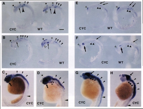 Zash-1a and Zash-1b expression in cyclops embryos. Zash-1a (A-D) or Zash-1b (E-H) antisense probes were hybridized to 14-hr (A, E), 18-hr (B, F), 24-hr (C, G), and 30-hr (D, H) embryos. In the 14- and 18-hr embryo panes, cyclops (on lef) and wild-type embryos (on right) are compared after removal of yolk. The 24- and 30-hr panes show only cyclops embryos (which can be compared to similarly hybridized wild-type embryos in Figs. 3 and 5). Symbols are exactly those used in Figs. 3 and 5, but in this case may point to expression sites which are absent in cyclops embryos. Scale bar in A, 100 μm (all panels at same magnification). EXPRESSION / LABELING: