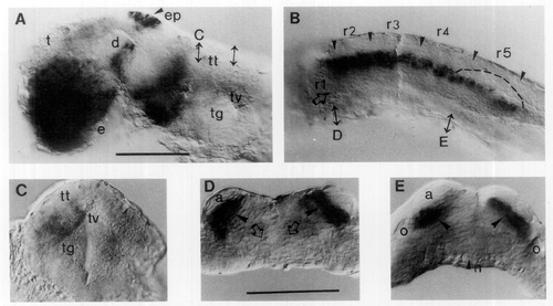 Localization of Zash-1a transcripts in the cyclops 24-hr CNS. Sections are of same regions illustrated in Figs. 4 and 6. (A) Longitudinal section of head (eye is deeply embedded and cannot be removed with the lateral portion of the head). (B) Longitudinal section of hindbrain, outline of otic vesicle is shown as dotted line. (C) Transverse section of anterior midbrain. (D) Transverse section of rhombomere 1. (E) Transverse section of rhombomere 4. Planes of transverse sections (C-E) are indicated by the double-headed arrows in (A) and (B). Plane of transverse section in Fig. 9B is indicated in (A) by a double-headed arrow without an accompanying letter. Scale bars, 100 μm, magnification of (A-C) is identical, and that of (D and E) is identical. Symbols and abbreviations as in Fig. 4 except that open arrows now indicate absence of ventral expression zone in rhombomere 1. |