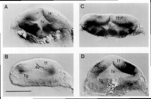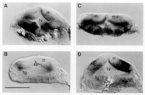 Localization of Zash-1a and Zash-1b transcripts in the posterior midbrain of 24-hr embryos. Transverse sections of wild-type (A, C) or cyclops (B, D) posterior midbrains of embryos hybridized with Zash-1a (A, B) or Zash-1b (C, D) probes. Planes of the sections are shown in (A) of each of Figs. 4, 6, 8, 10 as double-headed arrows (without a letter code) one side of which point to the tectum. Scale bar, 100 μm; magnification of all panels is identical. |
